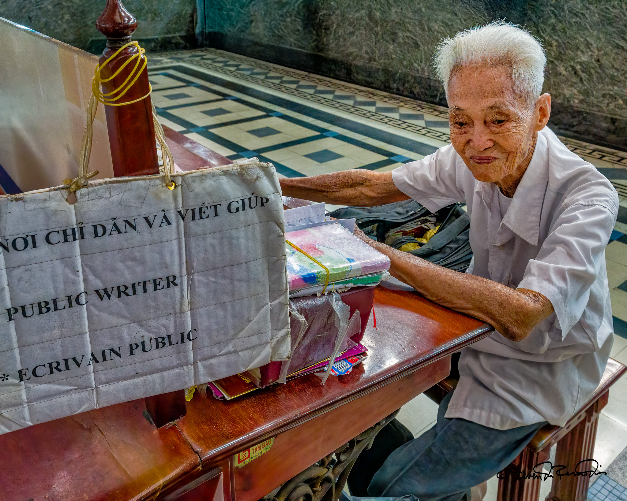 A public scribe offers handwritten letters inside Saigon’s historic central post office.