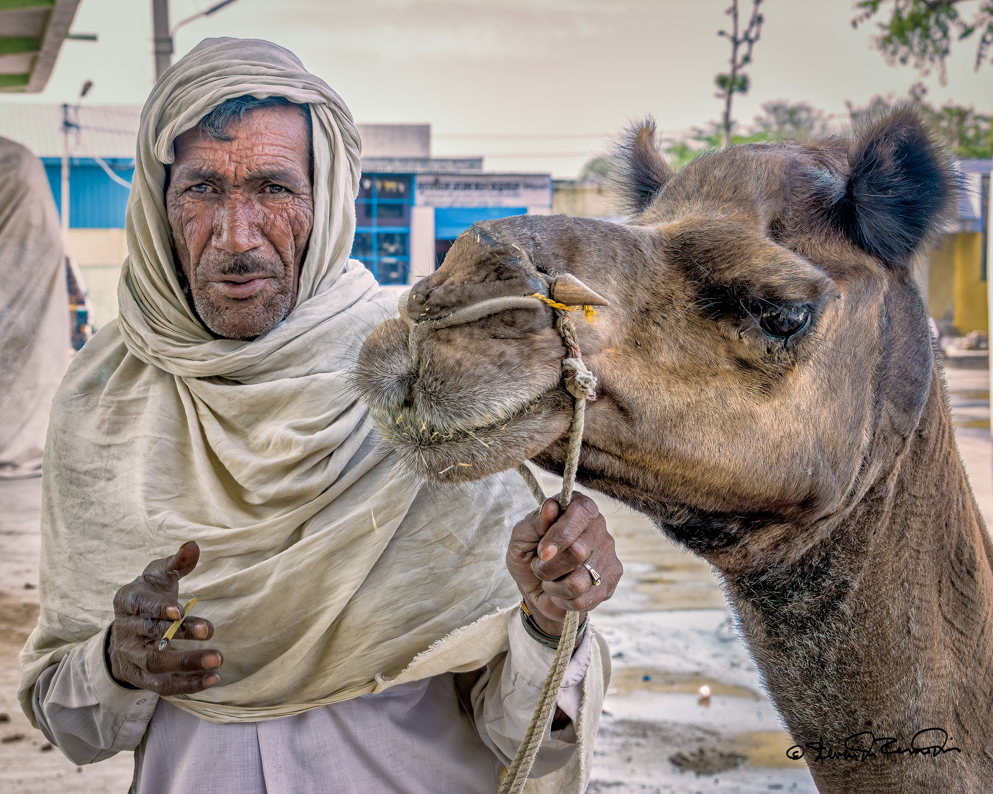 A village porter stands beside his camel enjoying a cigarette, ready for the day’s work.
