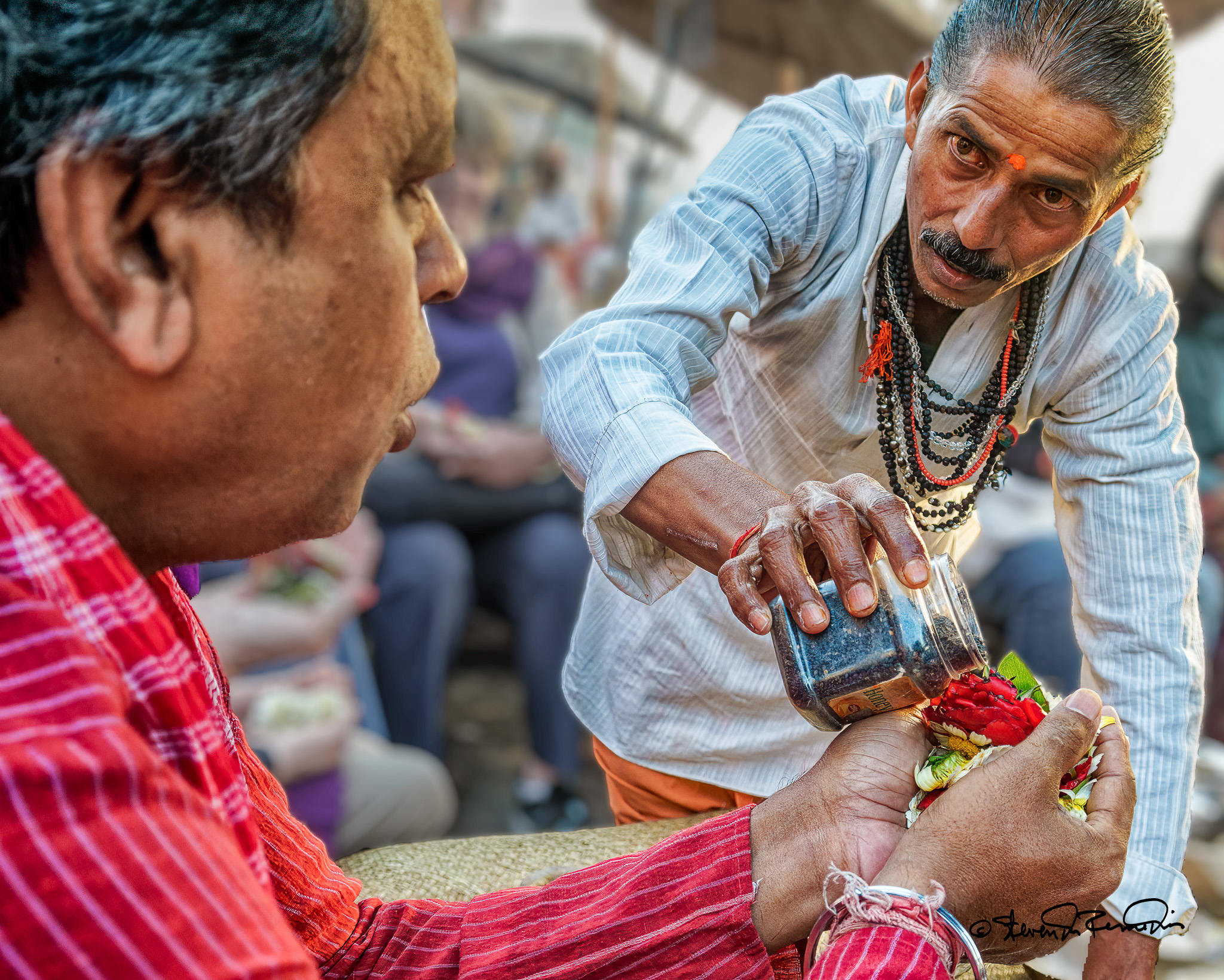 The man dressed in white, adorned with layered beads and a crimson tilak pressed to the center of his forehead, pours sacred ash into the open palm of another. The recipient, clad in red and holding a cluster of flowers, receives the offering with reverence.