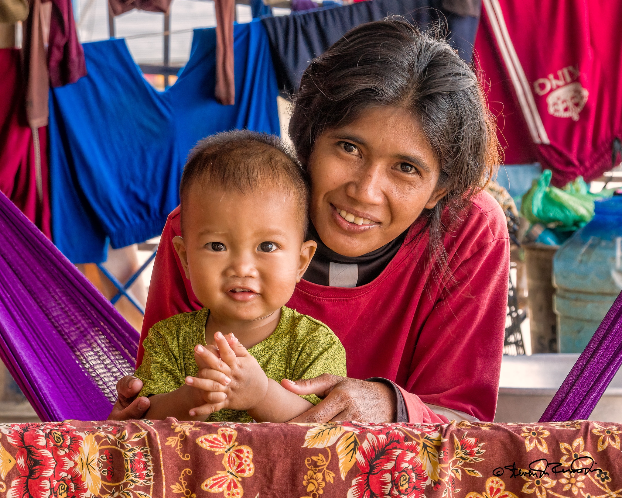 Amid the vibrant textures of daily life on Lake Tonlé’s floating city, a mother leans in with a smile as a child clasps their hands, eyes bright and fixed on the camera.