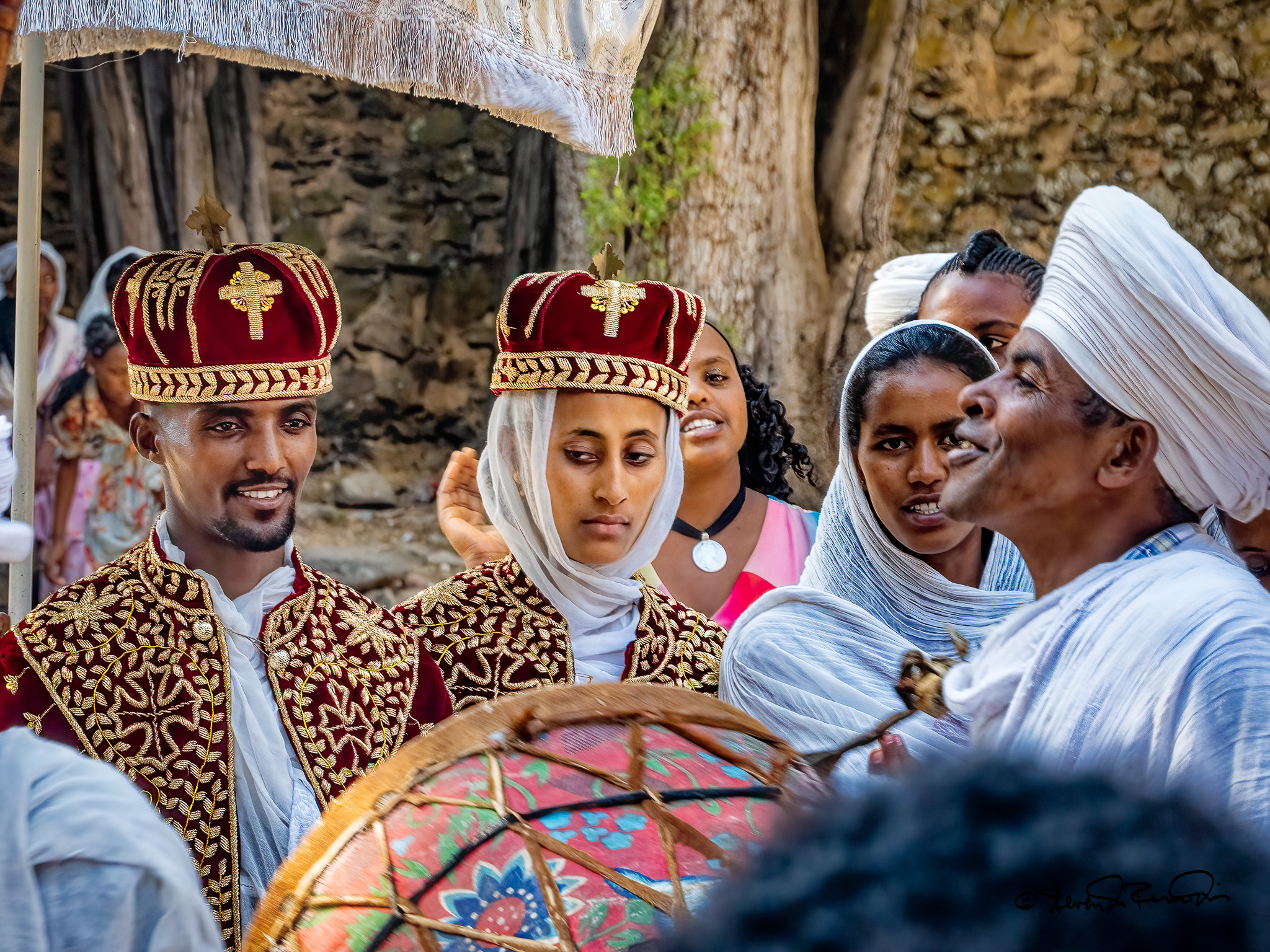 In the courtyard of Debre Birhan Selassie Church in Gondar, a newlywed couple stands radiant in matching red velvet robes embroidered with gold crosses, their crowns gleaming beneath the midday sun. The bride’s white veil flows gently as family and friends encircle them, chanting and clapping to the rhythm of a ceremonial drum.