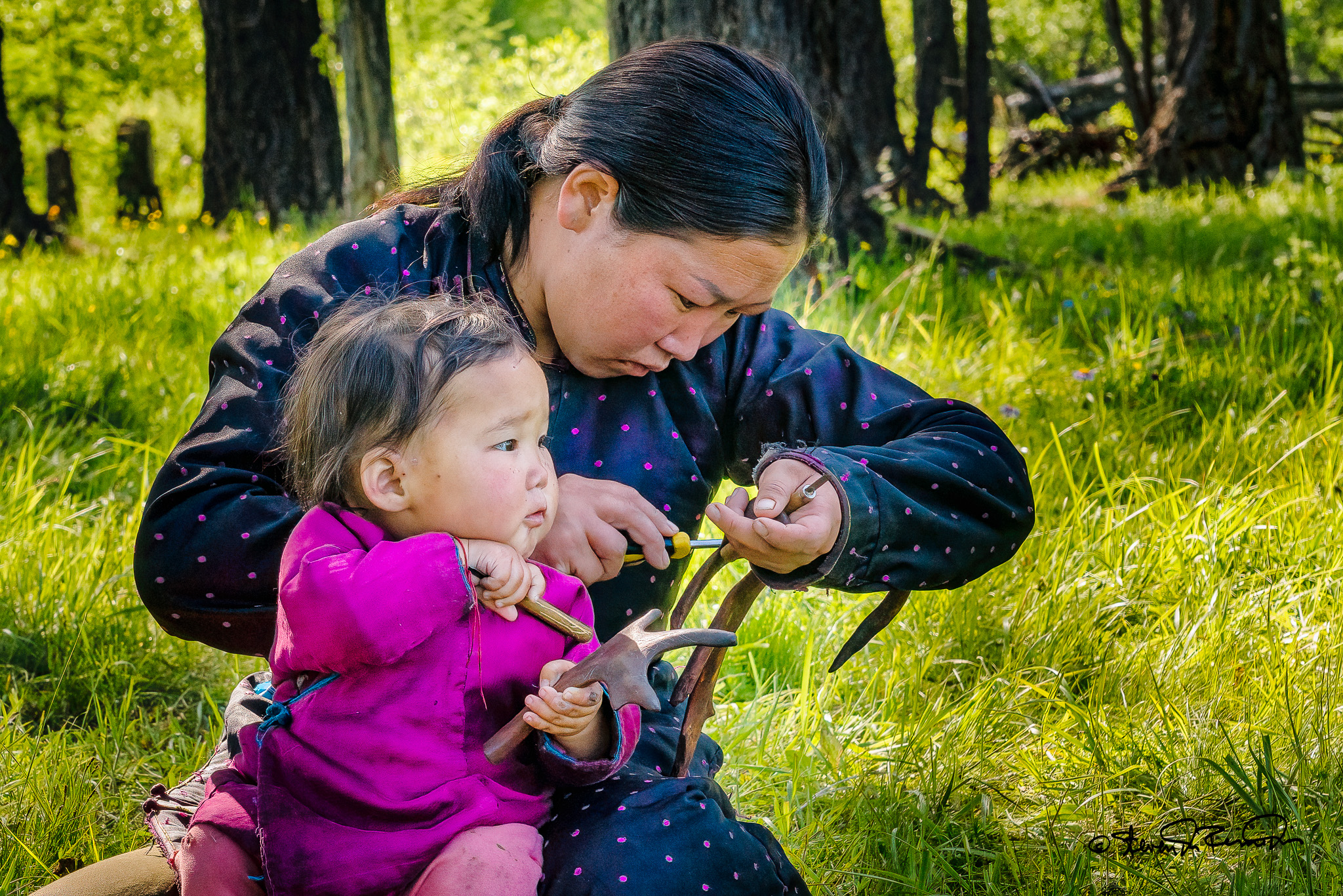A mother teaches her child traditional crafting skills near Khuvsgul Lake, Mongolia — steadying a reindeer antler in her lap as she etches its surface with a simple screwdriver.